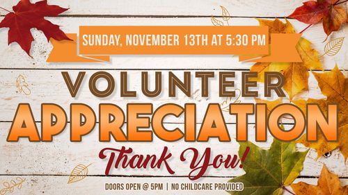 You're invited! To show our appreciation for you and all of our amazing TVC volunteers, we invite you to our Volunteer Appreciation Indoor Fall BBQ, Sunday, Nov, 13th at 5:30pm with doors opening at 5pm. Join us for a night of food, fun and fellowship as we say thank you for all the ways you've given of your time and effort to our church family. Although we love your little ones, this is an adult only volunteer event and we are not able to provide childcare. Please RSVP using the link below by Nov. 6th. We sincerely hope you will be able to join.